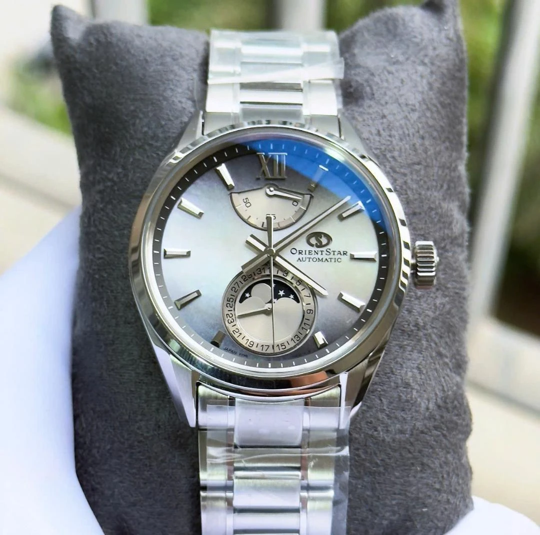 Đồng hồ tự động với chức năng hiển thị chu kỳ mặt trăng, thiết kế bạc/xám tinh tế.