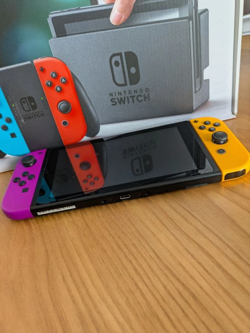 Máy chơi game Nintendo Switch với tay cầm Joy-Con màu neon.